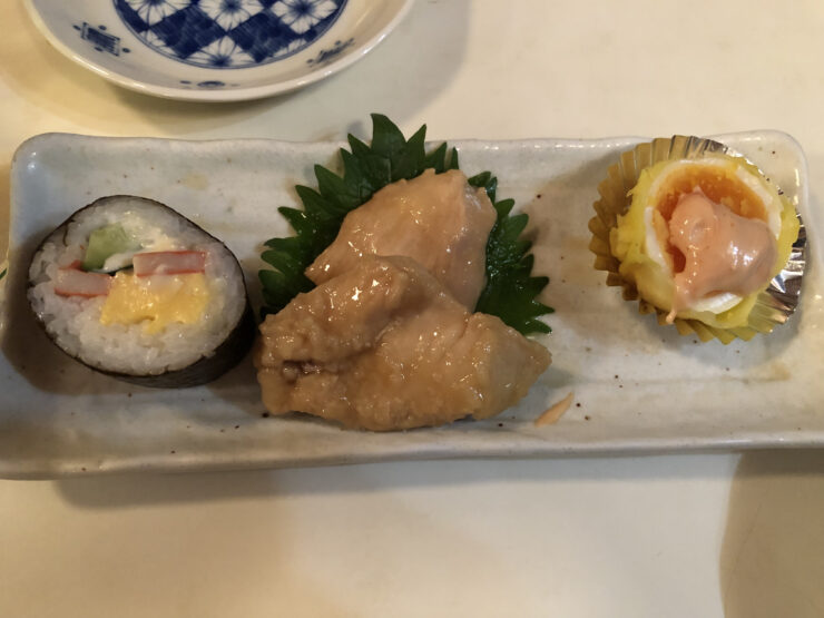 こちらがお通し。お寿司と鶏の煮物と卵。